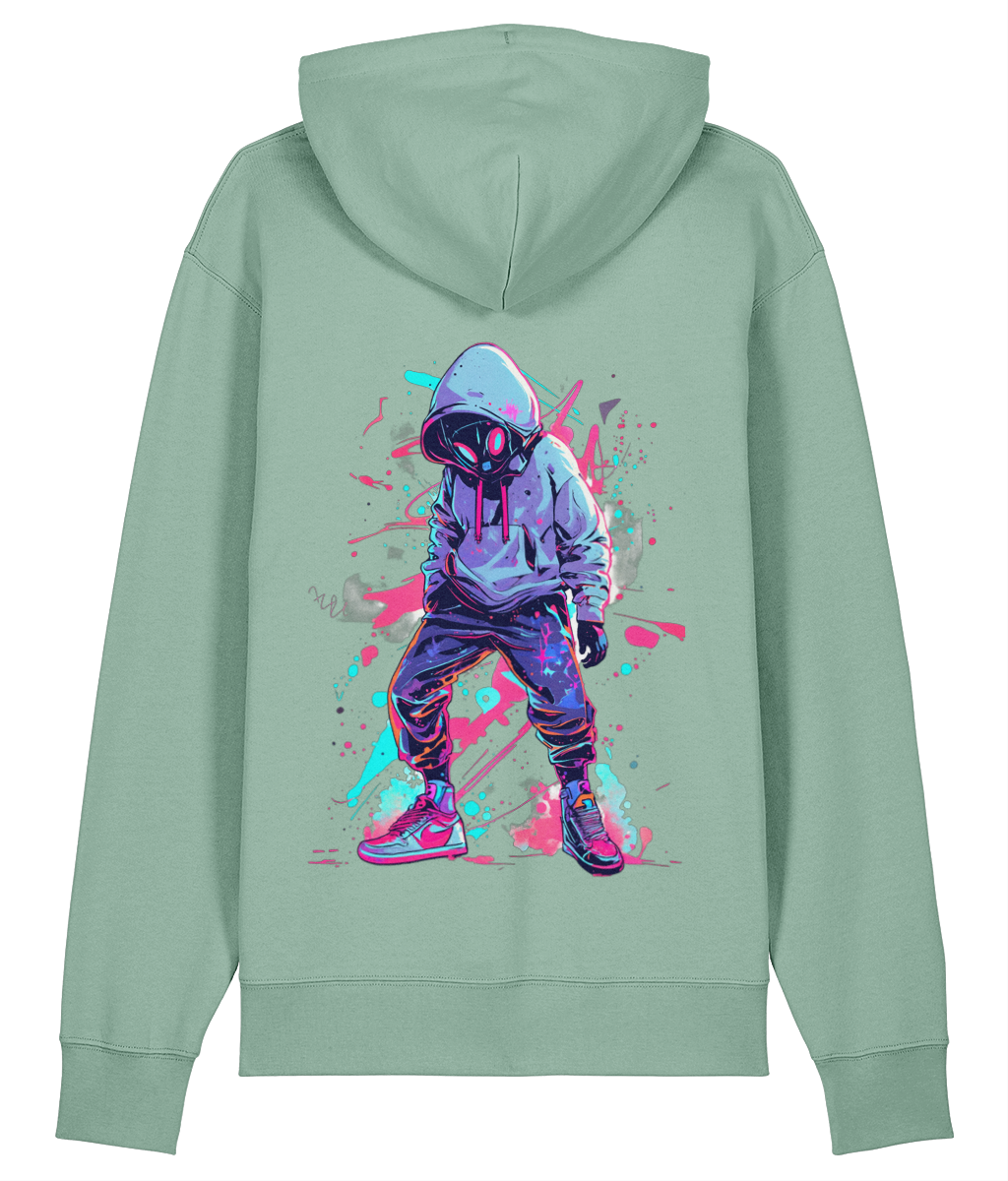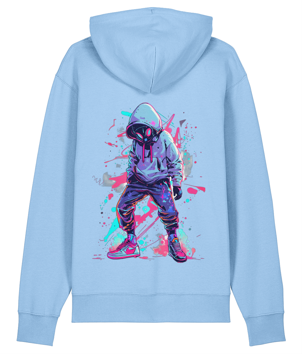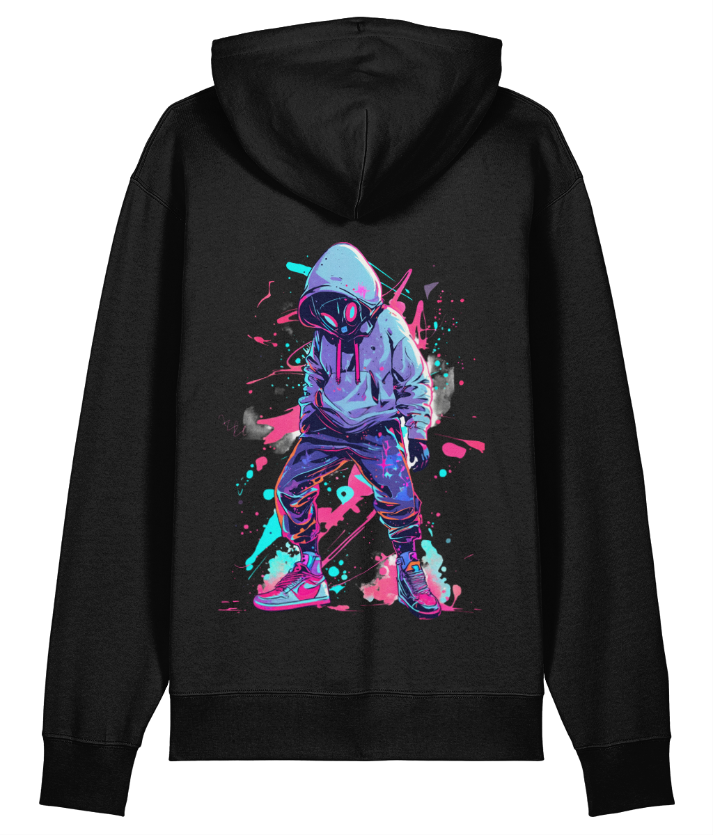 Unleash your inner rebel with the Neon Rebel Hoodie. Featuring a hooded street figure surrounded by explosive neon splashes of cyan, magenta, and violet, this design captures the pulse of underground art and street culture.