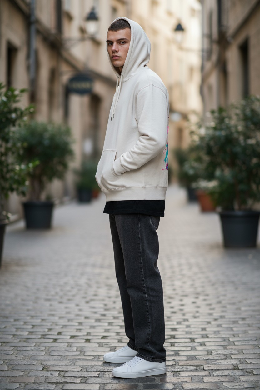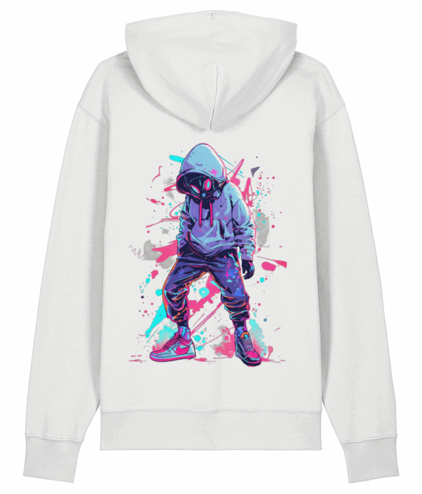 Unleash your inner rebel with the Neon Rebel Hoodie. Featuring a hooded street figure surrounded by explosive neon splashes of cyan, magenta, and violet, this design captures the pulse of underground art and street culture. Material: 100% organic ringspun combed cotton Medium fit. Single jersey. Set-in sleeve. 1×1 rib at neck collar. Inside back neck tape…
