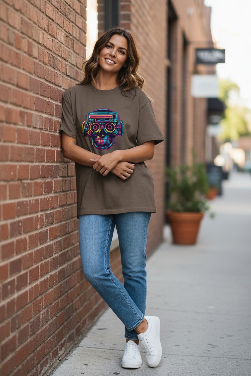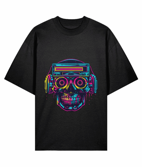 Turn up the volume on your style with the Retro Reaper Tee. This premium cotton T-shirt features a bold neon skull fused with a vintage boombox, an electric fusion of retro vibes and streetwear energy. Designed in vivid cyan, magenta, and yellow hues, it pops with 80s nostalgia and modern edge.