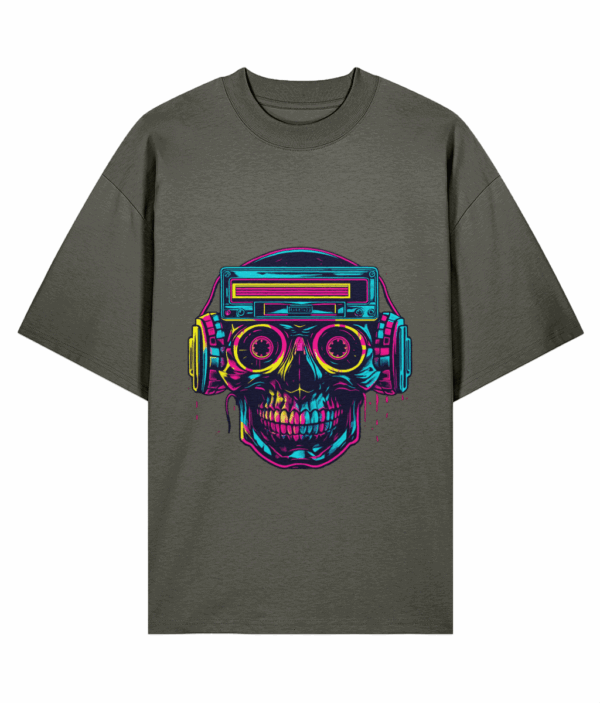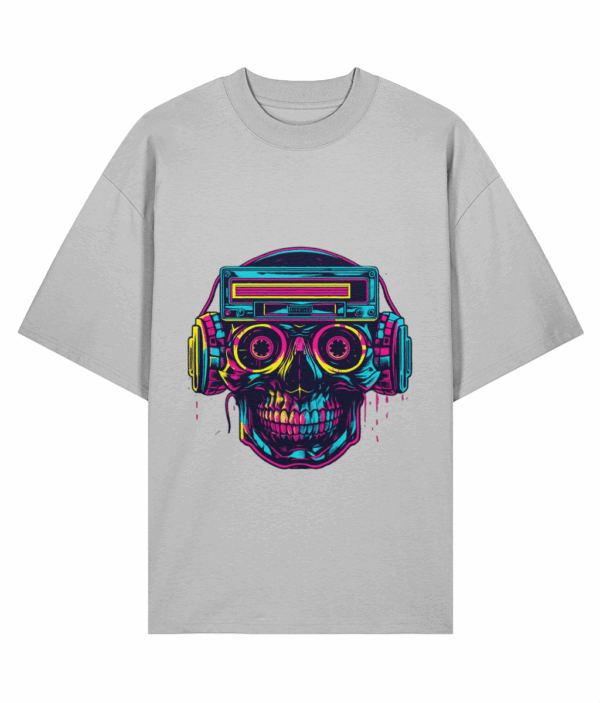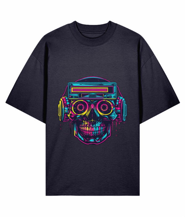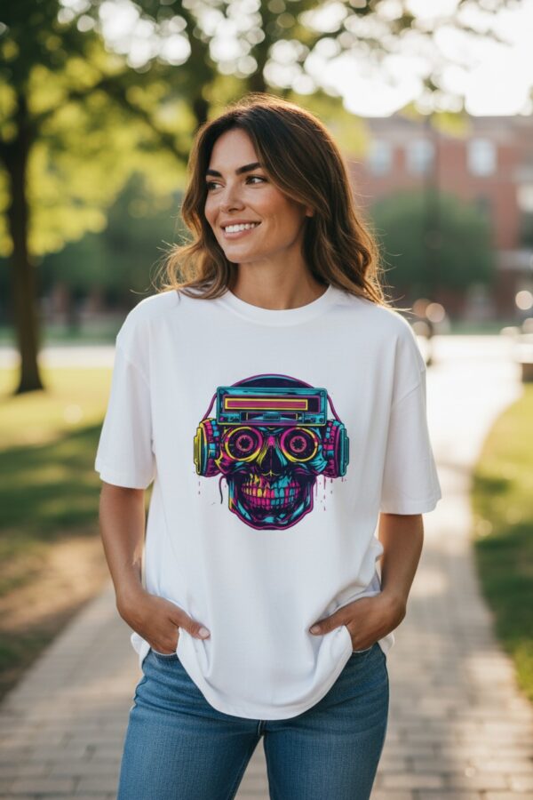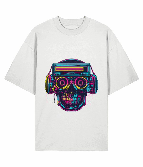 Turn up the volume on your style with the Retro Reaper Tee. This premium cotton T-shirt features a bold neon skull fused with a vintage boombox, an electric fusion of retro vibes and streetwear energy. Designed in vivid cyan, magenta, and yellow hues, it pops with 80s nostalgia and modern edge. Material: 100% organic ringspun…
